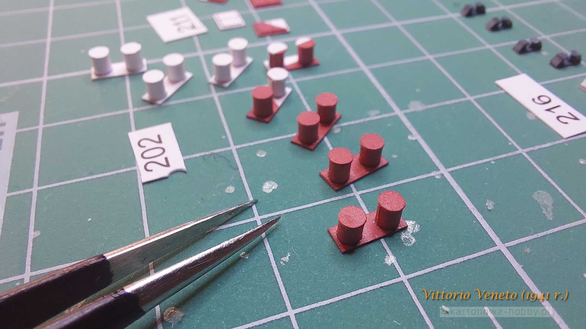 Kolory są różne, ponieważ dopasowane są do położenia na pokładzie, który jest biało-czerwony na dziobie i rufie oraz granatowy na śródokręciu. Postanowiłem, że muszę wymyśleć jak tu sobie ułatwić pracę z tymi maluszkami i jak w miarę zautomatyzować proces budowy, aby szła „hurtowo”. Wg instrukcji w środku znajdują się 4 krążki o tej samej średnicy. czyli potrzebowałem wiele krążków o średnicy 2 mm, ale żeby przyspieszyć proces i nie rozdrabniać się w męczenie sztancy biopsyjnej, która została użyta w celu wycięcia tych krążków, skleiłem ze sobą dwa kawałki kartonu będącego ścinką z arkusza z częściami. Taki sklejony kawałek dał mi już podwójną grubość, czyli grubością odpowiadał dwóm krążkom. Wystarczyło wyciąć tak sklejoną ze sobą całość.
